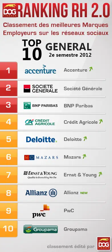 Le but du classement Dogfinance est de mettre en avant et de faire connaître les 10 meilleures marques employeurs sur les réseaux sociaux, et ce chaque semestre. Nous prenons en compte uniquement la communication RH des entreprises (et non leur communication corporate ou produits) sur les réseaux, avec des critères quantitatifs et qualitatifs. Nous analysons le nombre de fans sur Facebook ou d’abonnés sur Twitter, mais également le nombre de messages postés, la qualité et la diversité du contenu, les actions mises en place par l’entreprise, l’aspect visuel, les intéractions et la viralité (partages, likes, mentions, retweets,…). Chaque critère a une note et chaque entreprise se voit ensuite attribuer une note globale qui nous permet de la positionner dans le classement.